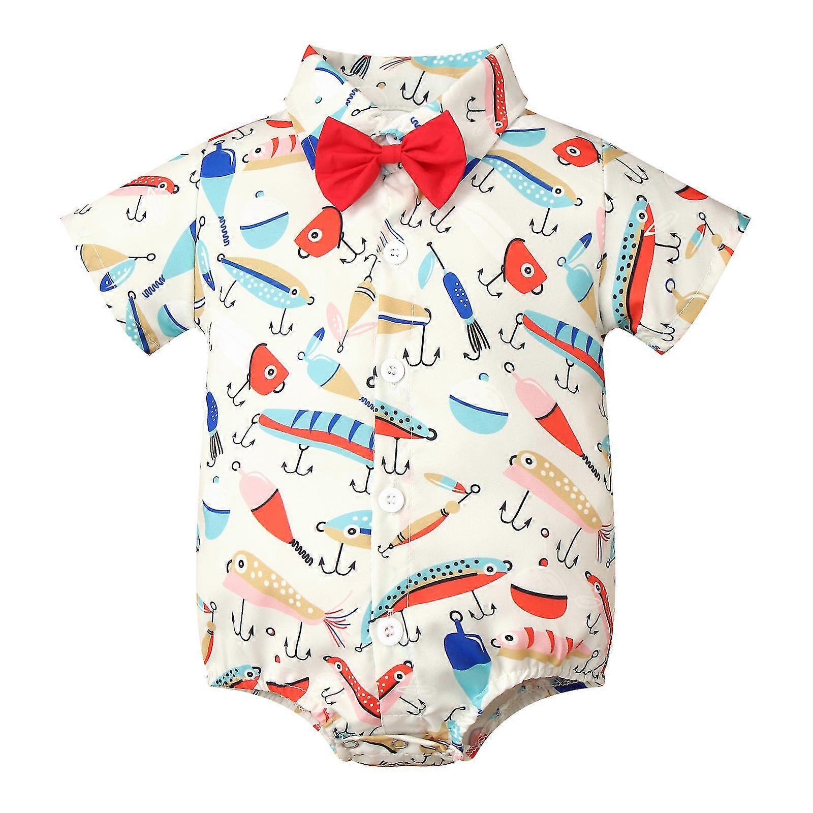 Infant Boys Christening Birthday Gentlemen Rompers Short Sleeve Cartoon Print Formal Bow Tie Bodysuit for Wedding Photography