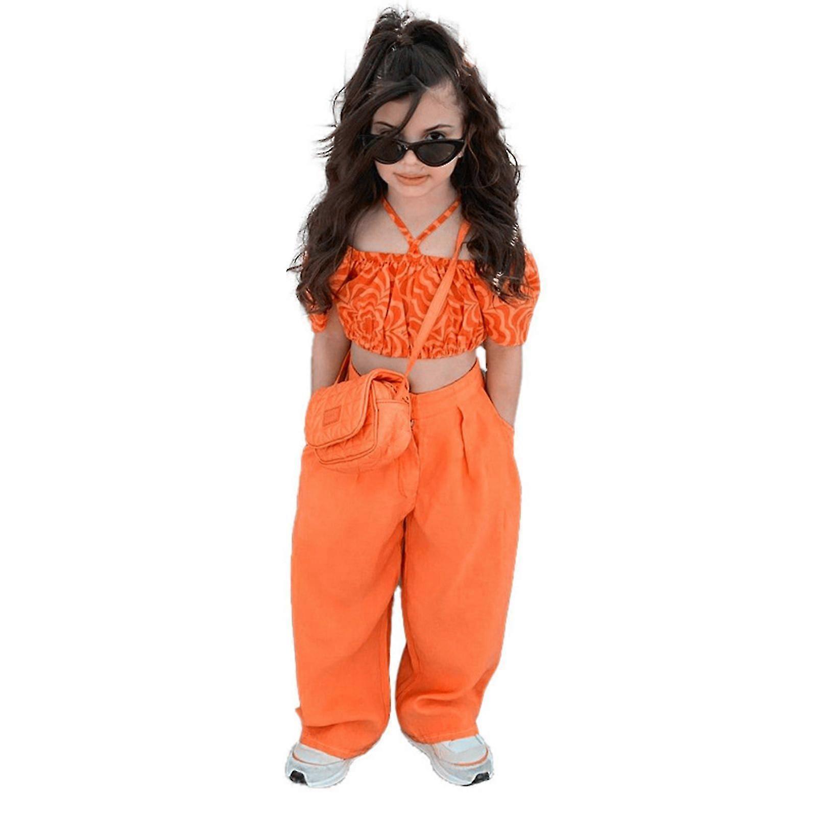 Baby Toddler Kids Girls Clothes Sets 2pcs Halter Pleated Puff Sleeve Top Straight-Leg Pants Sets Outfits rose Red 90cm