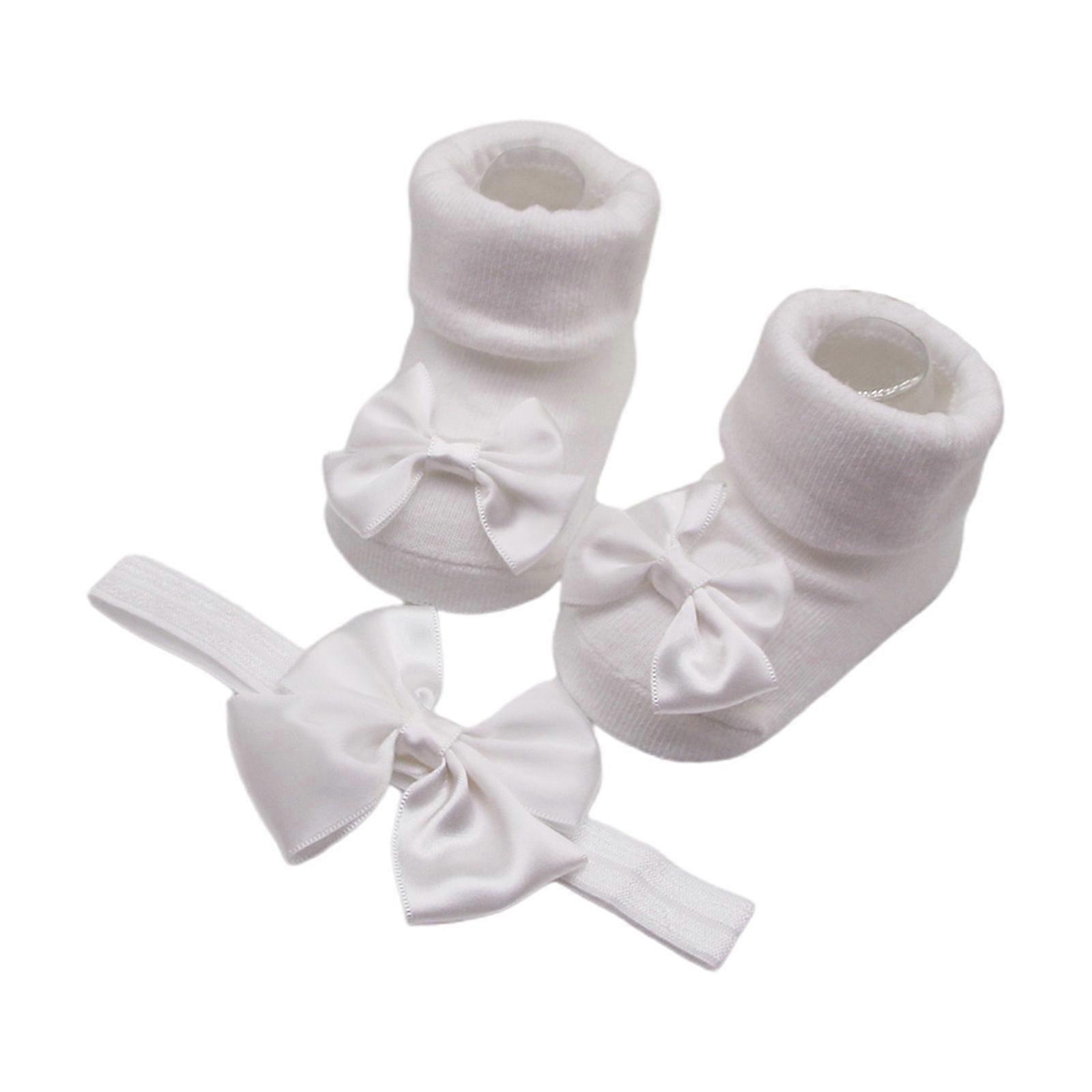 Baby Lace/Satin Headband Short Socks Newborn Anti-Slip Socks Hair Bow Hair Bands Newborn Accessories Infant Shower Gift White