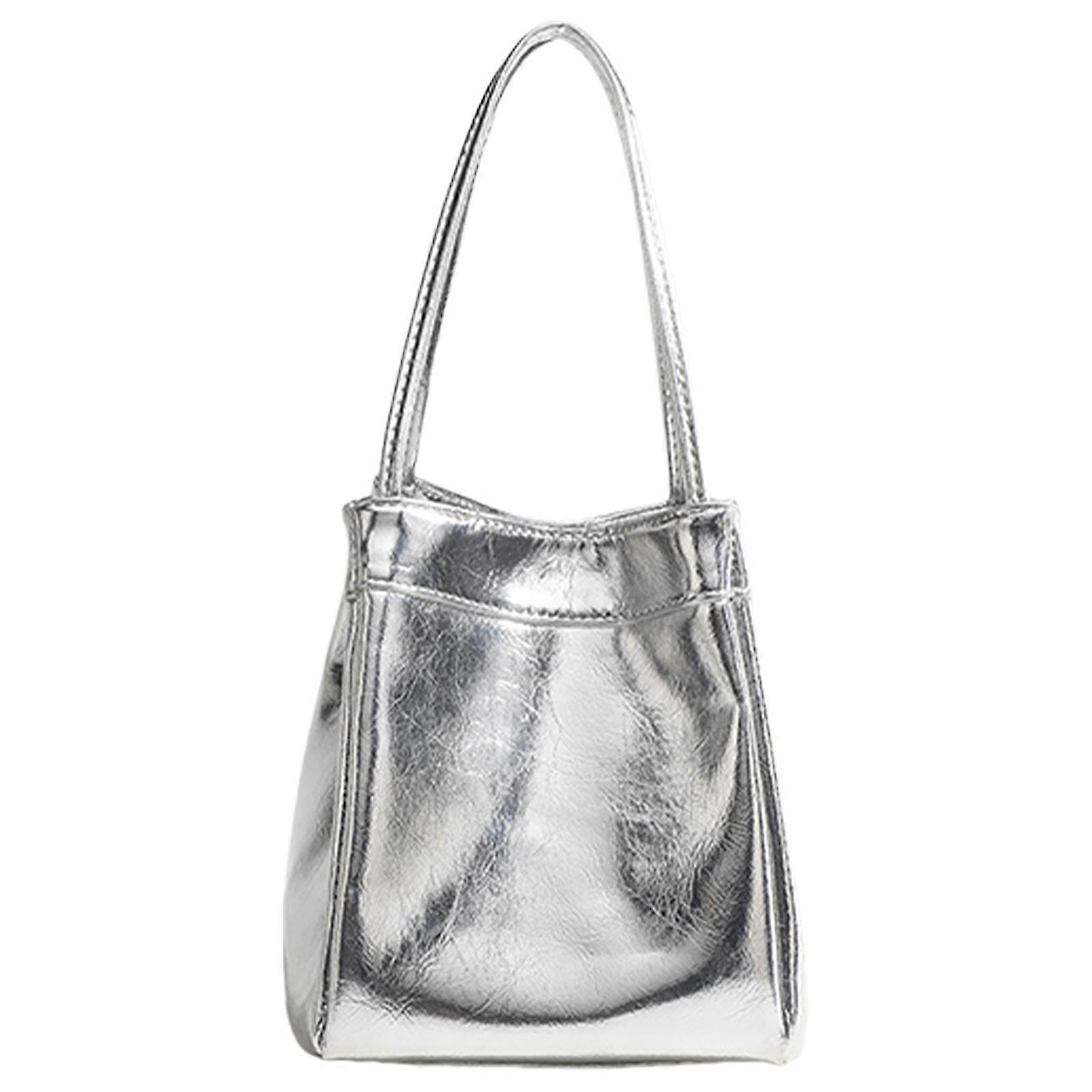 Womens PU Leather Armpit Bag Casual Bucket Shoulder Bag Korean Styles Handbag All-matching Underarm Bag Shopping Bag Silver