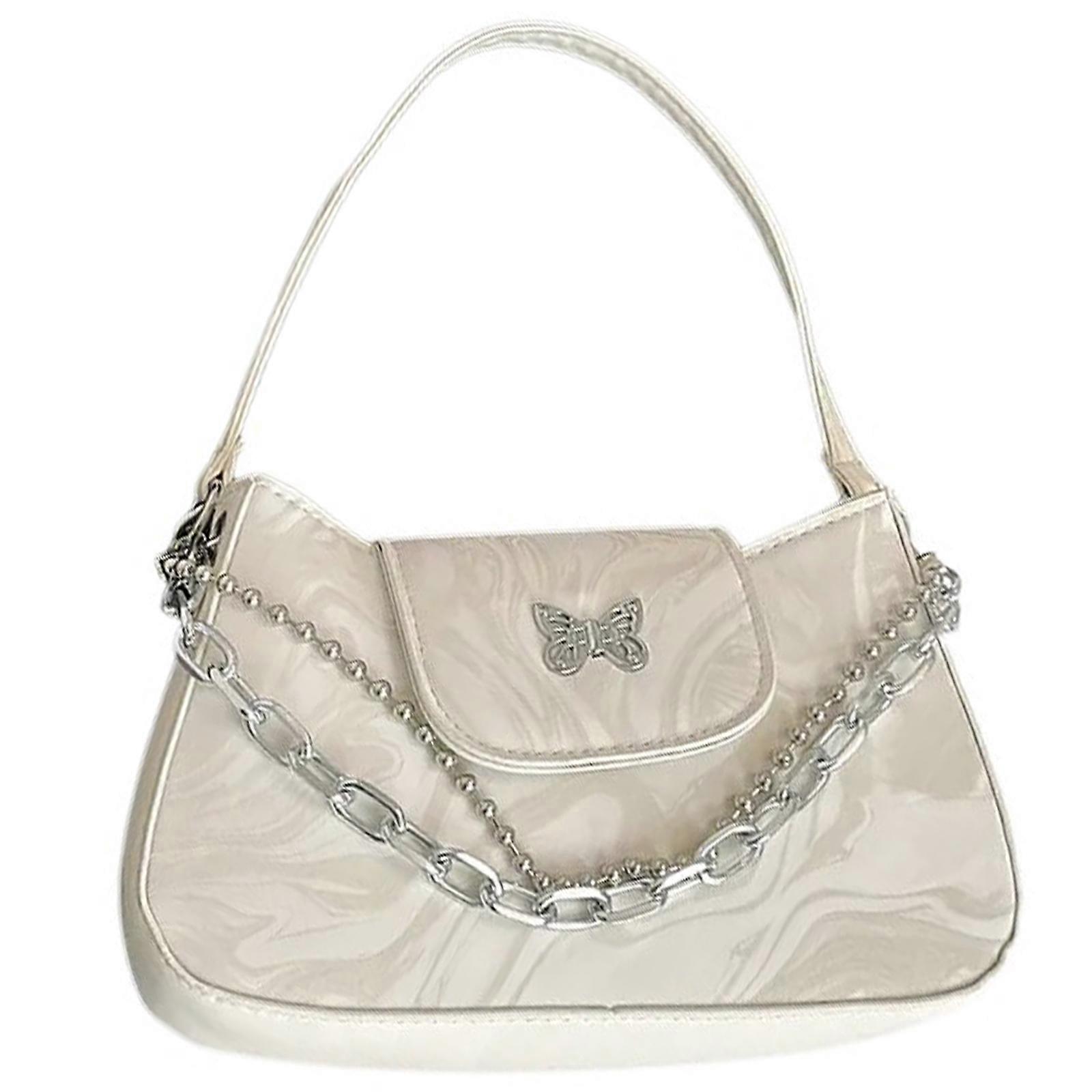 Fashionable Handbag Retro PU Leather Shoulder Bag with Butterfly Designs for Women Korean Solid Color Underarm Purse White