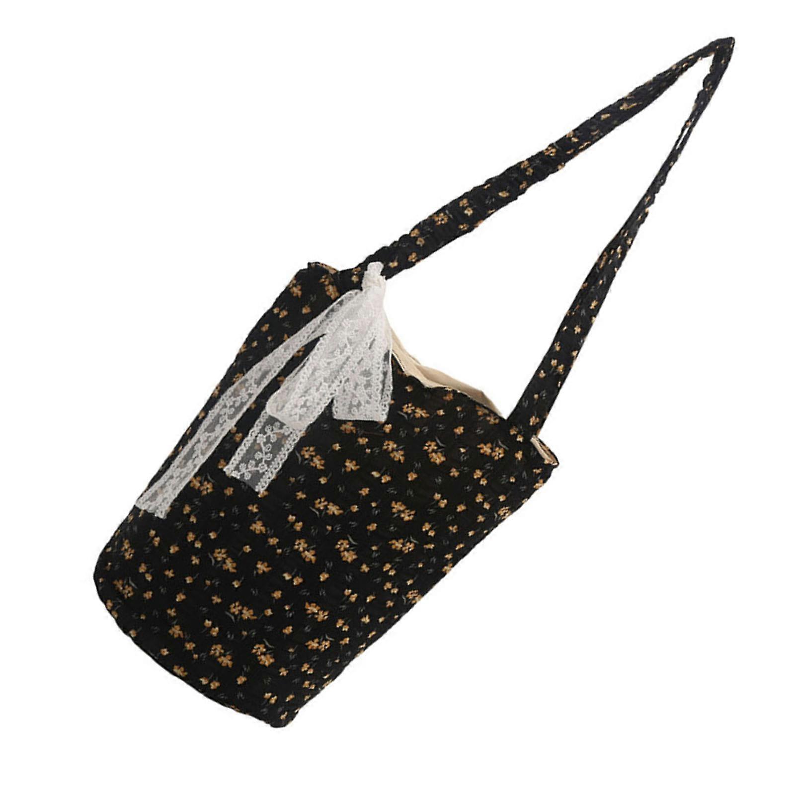 French Vintage Floral Canvas Shoulder Bag with Large Capacity Bucket Bag Lace Bowknot Handbag Purse for Fashion Women Black