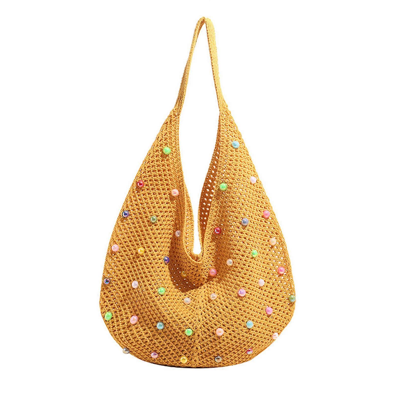 Women Crochet Shoulder Bag with Colored Beads Handbag Aesthetic Armpit Bag Fashion Beach Bag Knit Bag for Travel Yellow