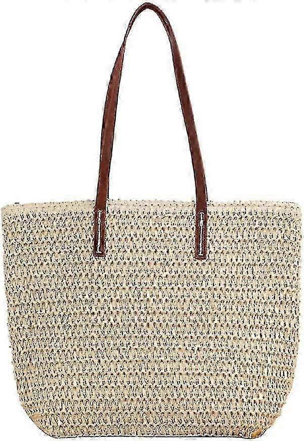 Women's Hand-woven Straw Shoulder Bag Large Summer Beach Leather Handles Handbag Tote With Zipper