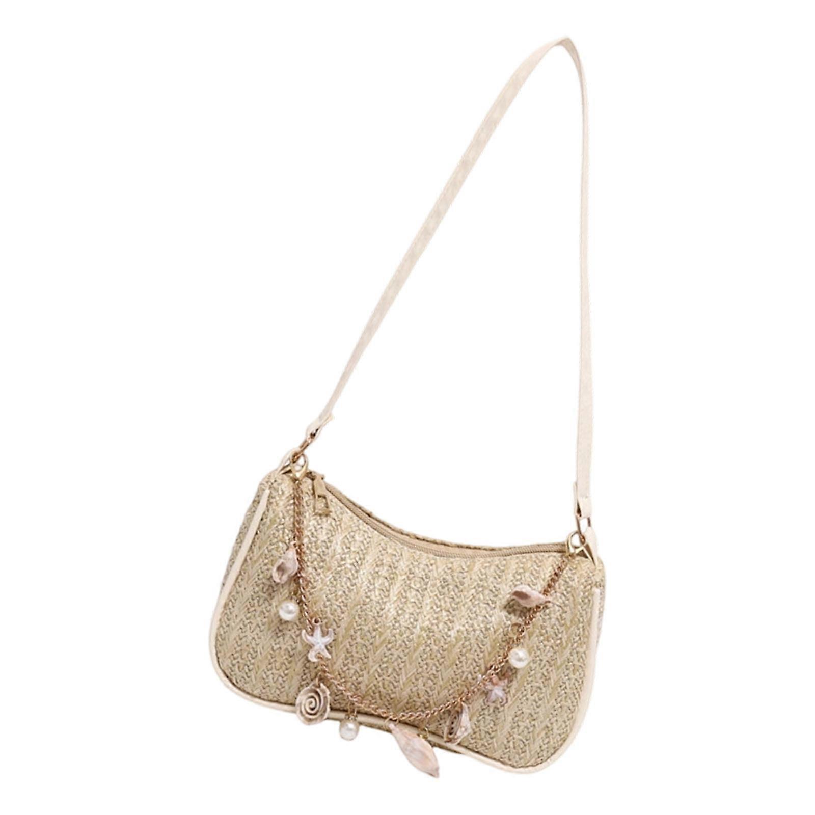 Compact Straw Shoulder Bag Pearls Decorated Strap Convenient Carrying Solution Fashion Underarm Purse for Women Khaki