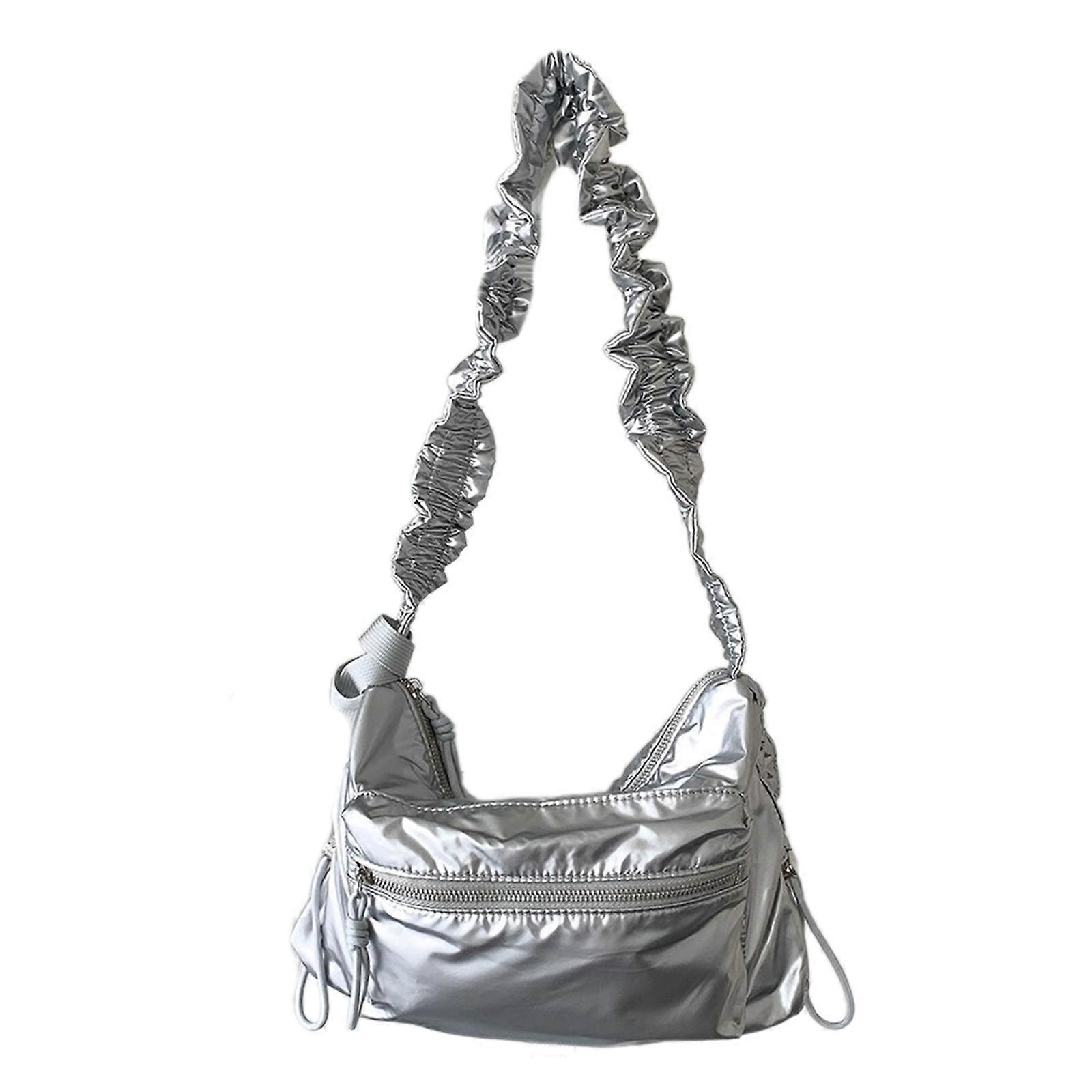 Trendy Nylon Handbag with Ruched Detail Women's Crossbody Casual Shoulder Bag with Drawstring Adjustable Strap Silver