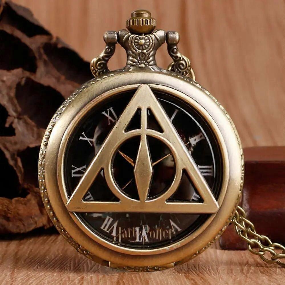 Retro Bronze Triangle The Deathly Hallows Lord Analog Quartz Pocket Watch Necklace Collectibles for Men Women Kids