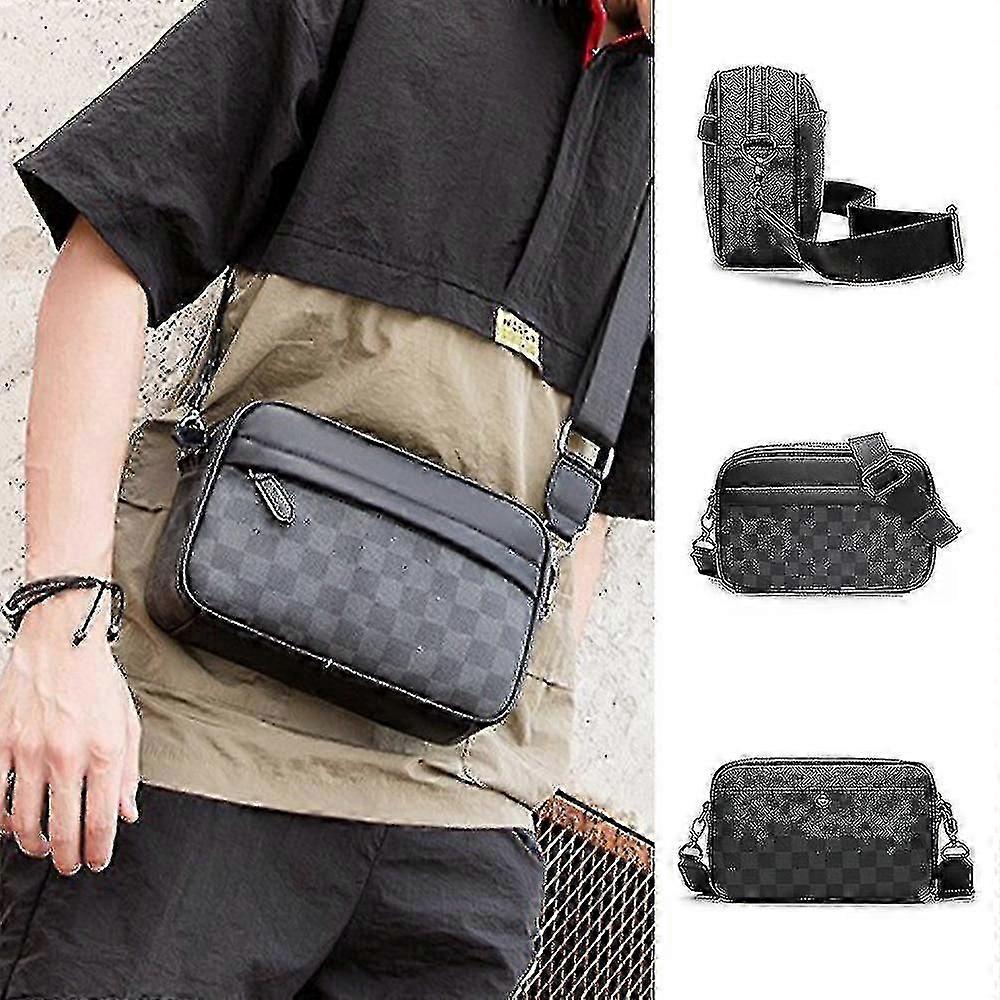 Men's Casual Plaid Shoulder Bag Leather Crossbody Pouch Adjustable Strap Messenger Bag