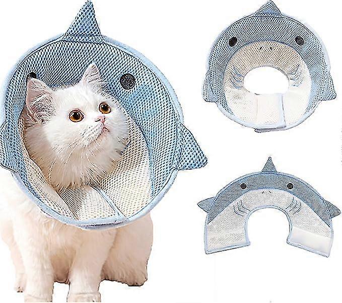 Cat Cone Collar Soft, Adjustable Cat Recovery Collar, Lightweight Breathable Collars, Cute Shark Design, After Surgery Blue Neck Girth: 11-12.2 inch