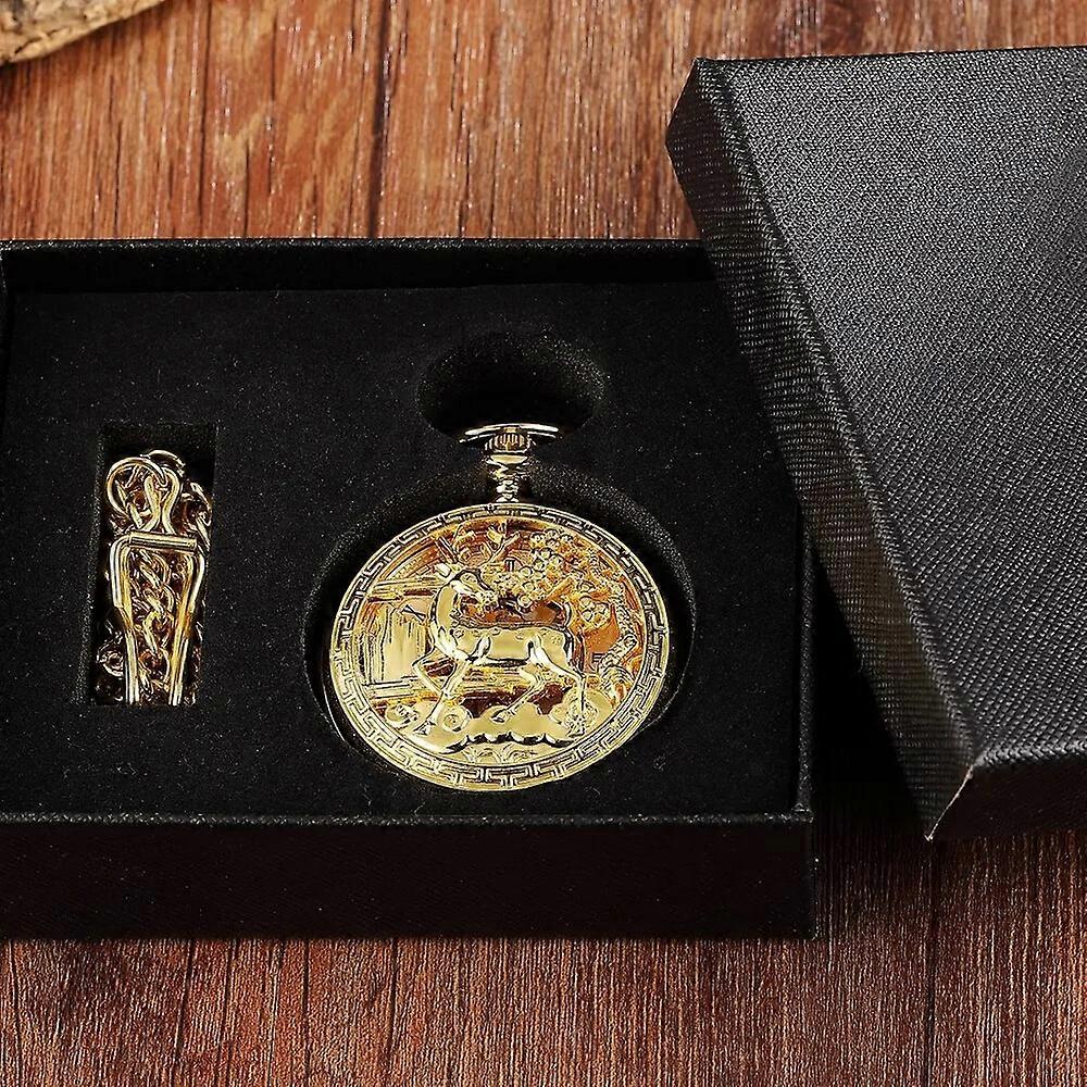 Golden Hollow Deer Pattern Mechanical Pocket Watch Vintage Double Side Steampunk Fob Clock Male Necklace Watch Chain Women Men