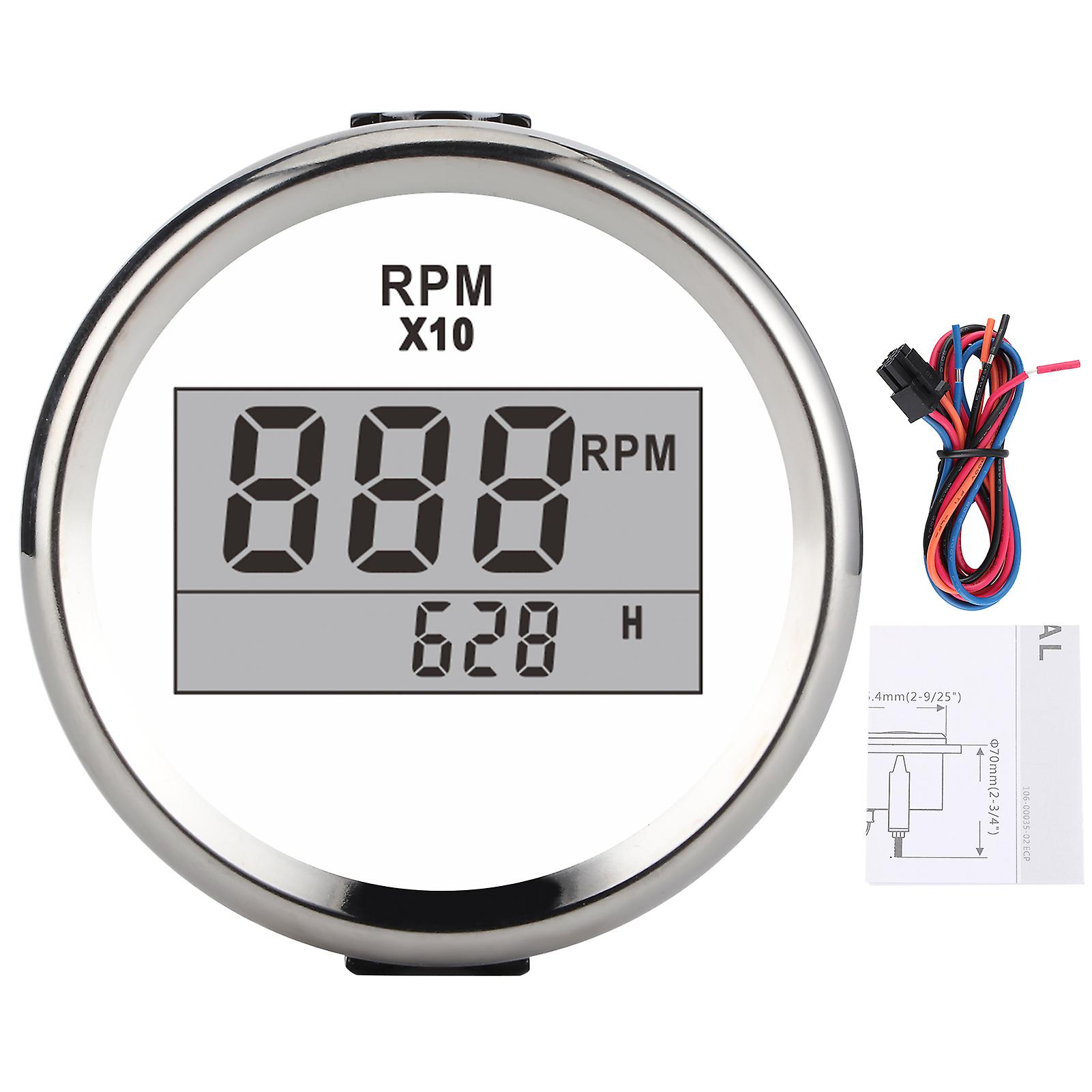 0‑9990RPM Tachometer Gauge IP67 Waterproof Red Backlight 52mm/2in LCD Display 9‑32hite Dial Silver Cover