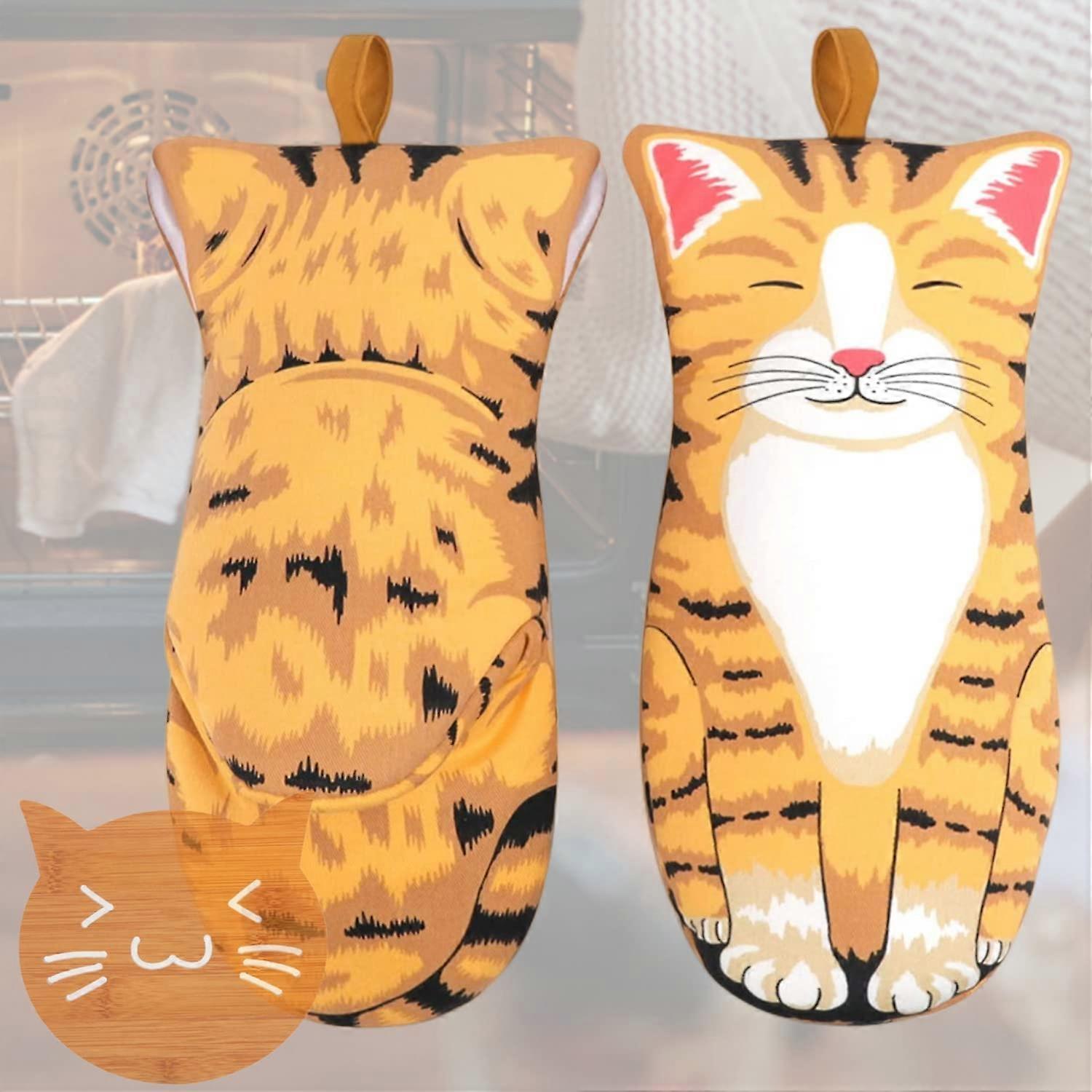 1 Pair Cat Oven Mitts with Free Cat Insulated Mat Cotton Lining Heat Resistant Oven Gloves Kitten Baking Cooking Gloves Microwave Gloves Potholder Non