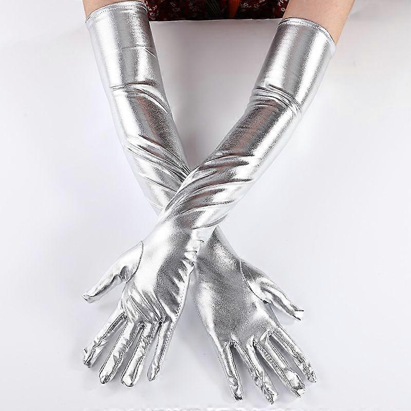 1 pair of sexy patent leather gloves tight lengthened gloves bright leather coated steel tube dance performance gloves (silver)
