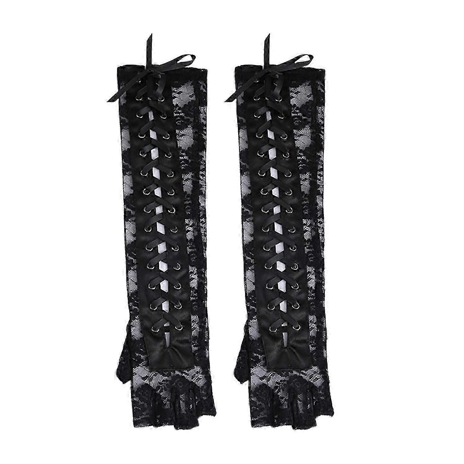 1 Pair Women Halloween Gloves Lace-up Strap Hollow Out Lace Half Finger Thin Flower Embroidery