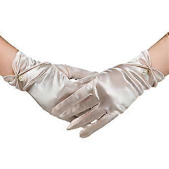 1 Pair Retro Smooth Satin Bride Gloves Faux Pearls Decor Pleated Cuffs Solid Color Vintage Wedding Gloves/YY