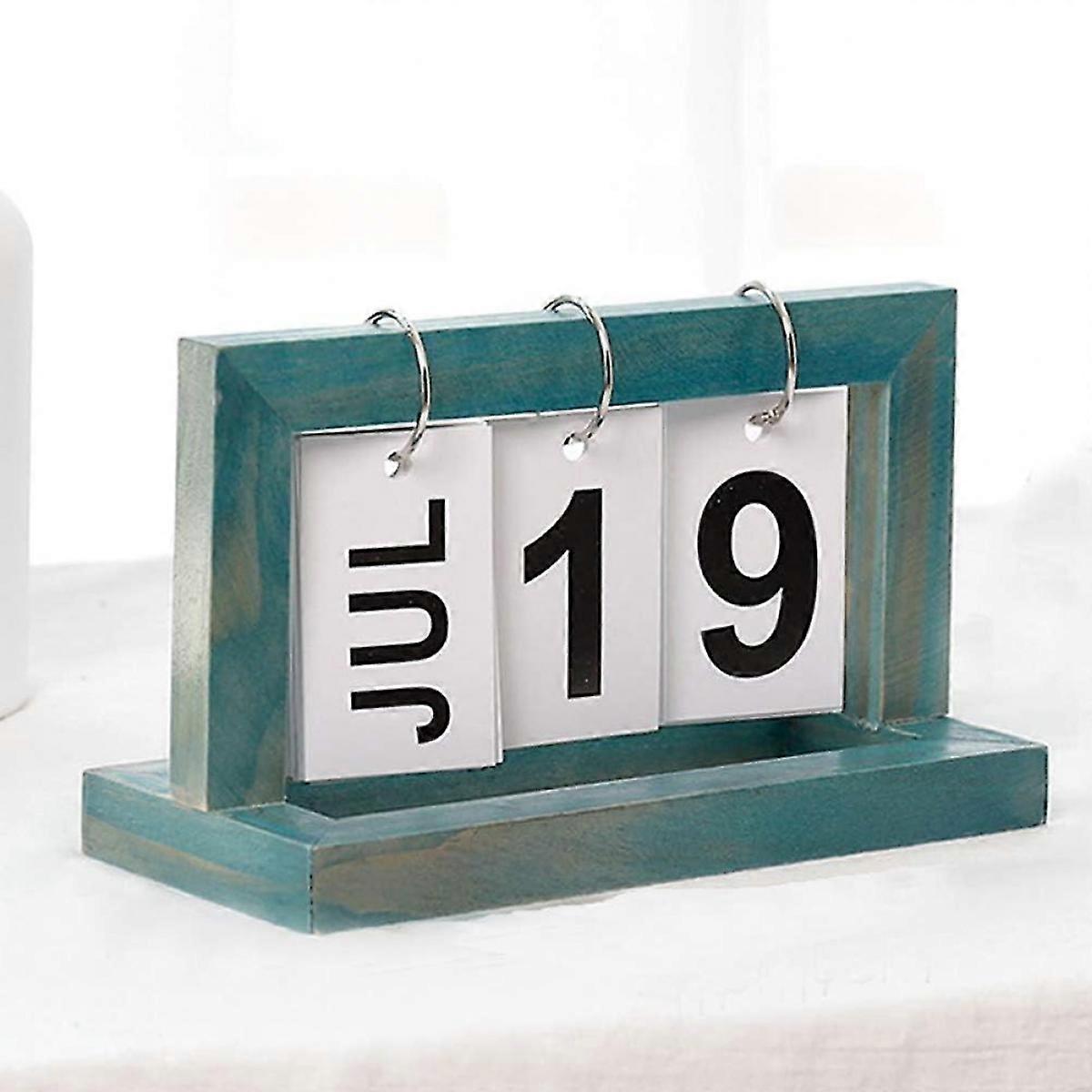1pc Wooden Vintage Perpetual Calendar with Flip Handmade Desktop Antique Wooden Calendar Office Decor (Blue)