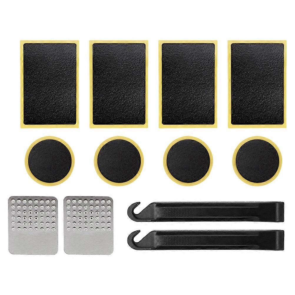 Description The bike tire repair tool is made of premium material, sturdy and durable. Some tools' unique designs can be folded into a small size, easy to carry and store. Multipurpose repair kit, it can meet a variety of needs. It is a necessary tool for outdoor bike travel. Features -Color: Black, silver-Material: plastic, rubber, alloy-Size: 5.00X3.20X0.20cm/1.97X1.26X0.08in-Adopts precision production to stable characteristics and high reliability. You can use it confidently.-The total weight of these tools is not big, it is easy to carry, bringing convenience when you go out.-Essential tools for cycling enthusiasts, it is a necessity for you in case of the accident. Also, a nice gift for them.-The tire tie level is used to help disassemble the bike's tire. After cleaning, attach the wheel patch and the wheel will be repaired.-Fine workmanship and creative appearance ensure its popularity and practicality. Packing list: 8 x tire patches2 x pry bars2 x tire grinding sheets