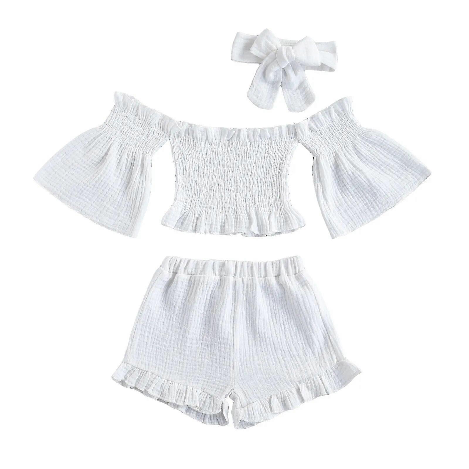 1-6Y Summer Fashion Kid Baby Girls Clothes Sets Short Sleeve Off Shoulder Crop Tops Shorts Headband 3Pcs Outfit Sets