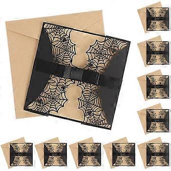 10 pcs creative cut-out Halloween invitations hollow horror party invitation cards Spider web design cards with bows (black)