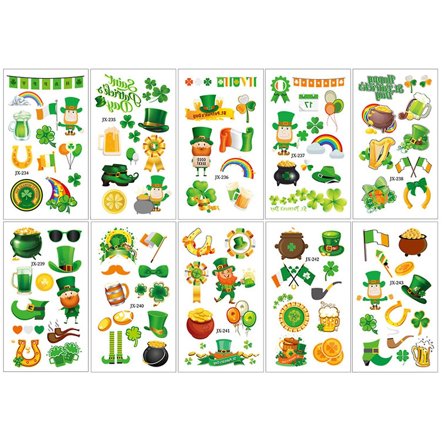 10 Pcs St. Patricks Day Children Body Tattoo Stickers Shamrock Pattern Cartoon Waterproof Green Hat