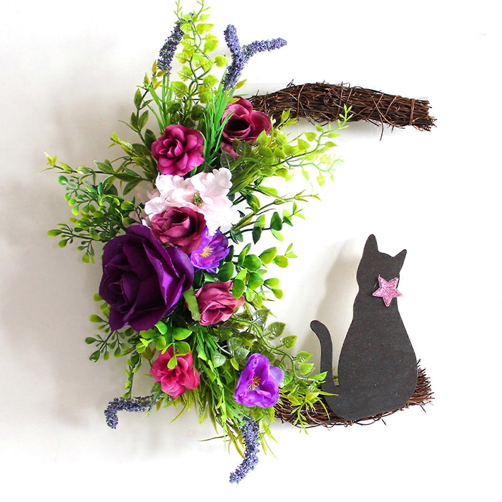 100% New Artificial Wreath 30cm Black Cat Stares at the Moon Decor Hanging Wall