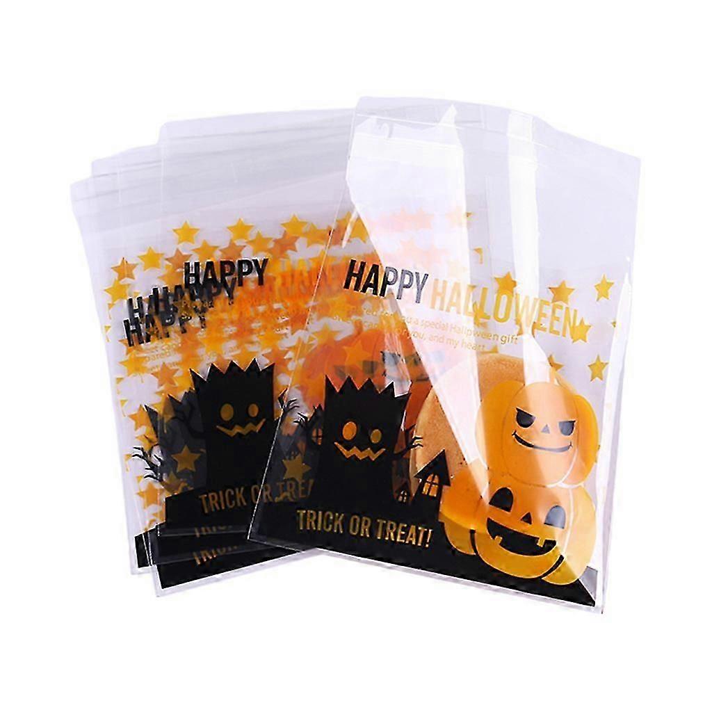 100 Pieces Halloween Candy Biscuit Bag Self Adhesive Cartoon Pumpkin Witch Ghost Print Clear Treat or Trick Packaging Snack Bags for Bakery Dessert P