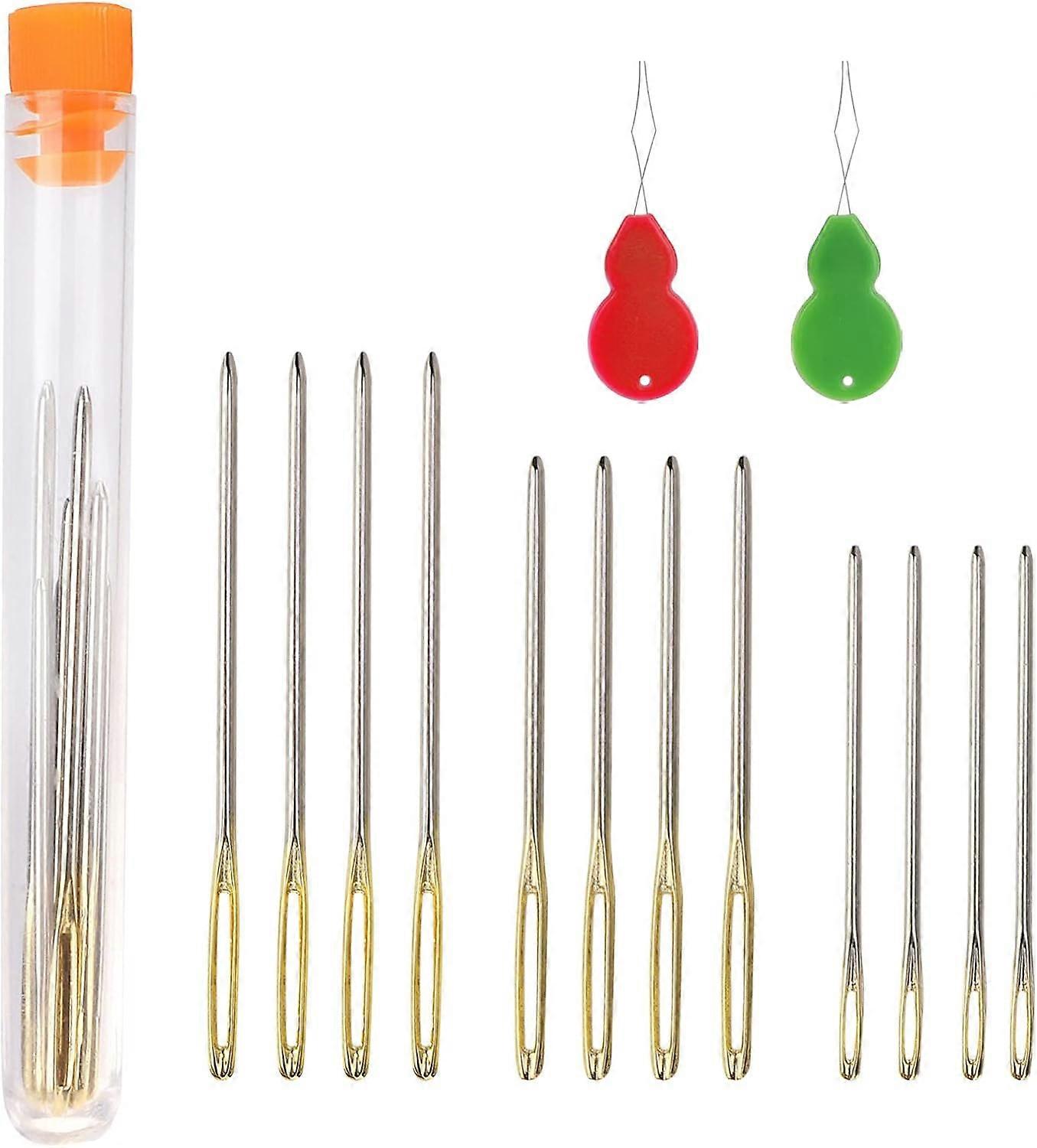 12pc Big Eye Blunt Needles, Gold Eyes Sewing Needles Stainless Steel Big Eye Needles with 2 Needle Threader, 1Clear Plastic Test Tubes