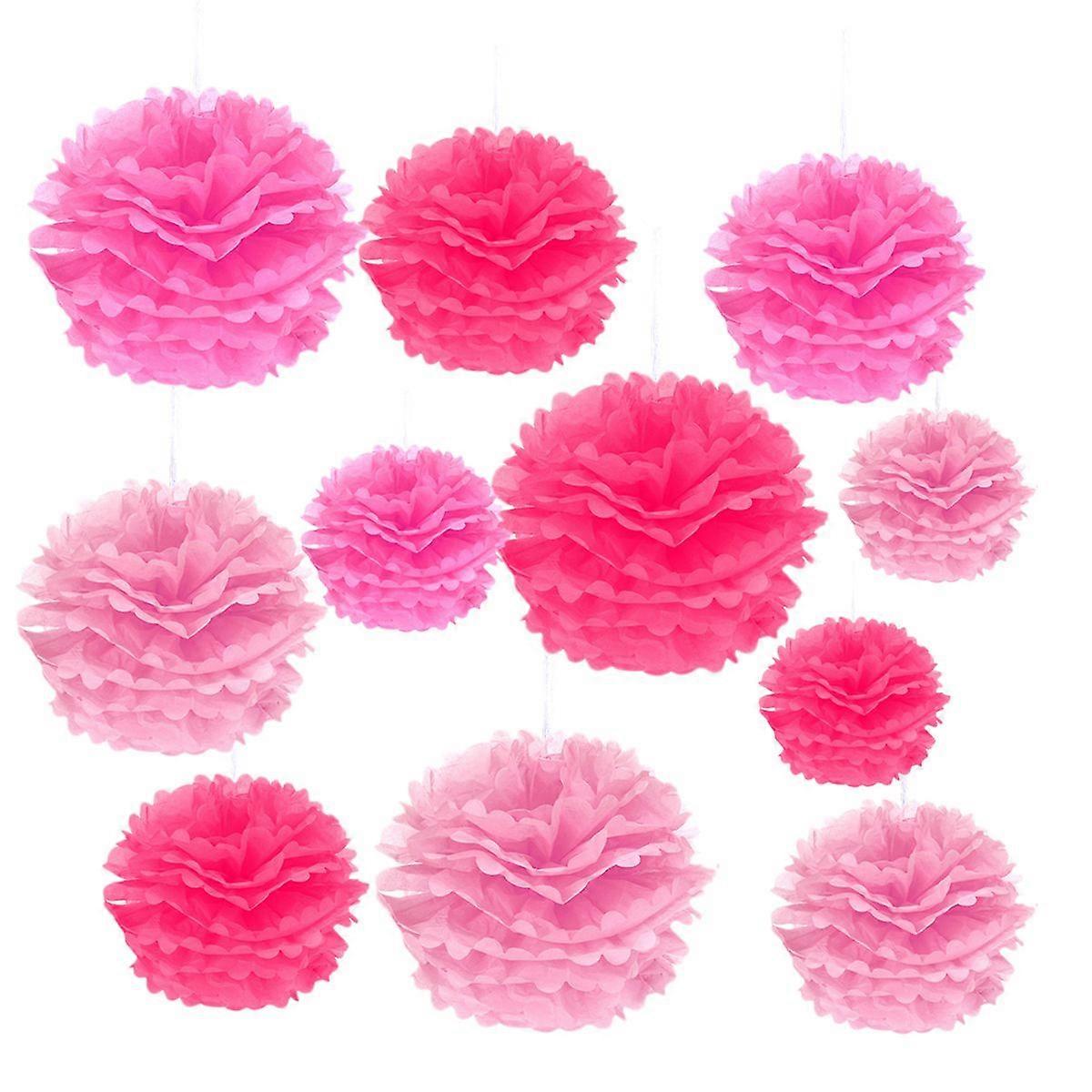 12PCS Tissue Hanging Paper Pom-poms Flower Ball Wedding Party Outdoor Decoration Premium Tissue Paper Pom Pom Flowers Craft Kit (Pink+Rosy+Light Pink)
