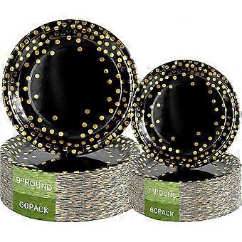 120 יח' צלחות נייר שחור וזהב המתאימות למסיבת יום הולדת, כוללות 9 צלחות ארוחת ערב ו-7 צלחות קינוח