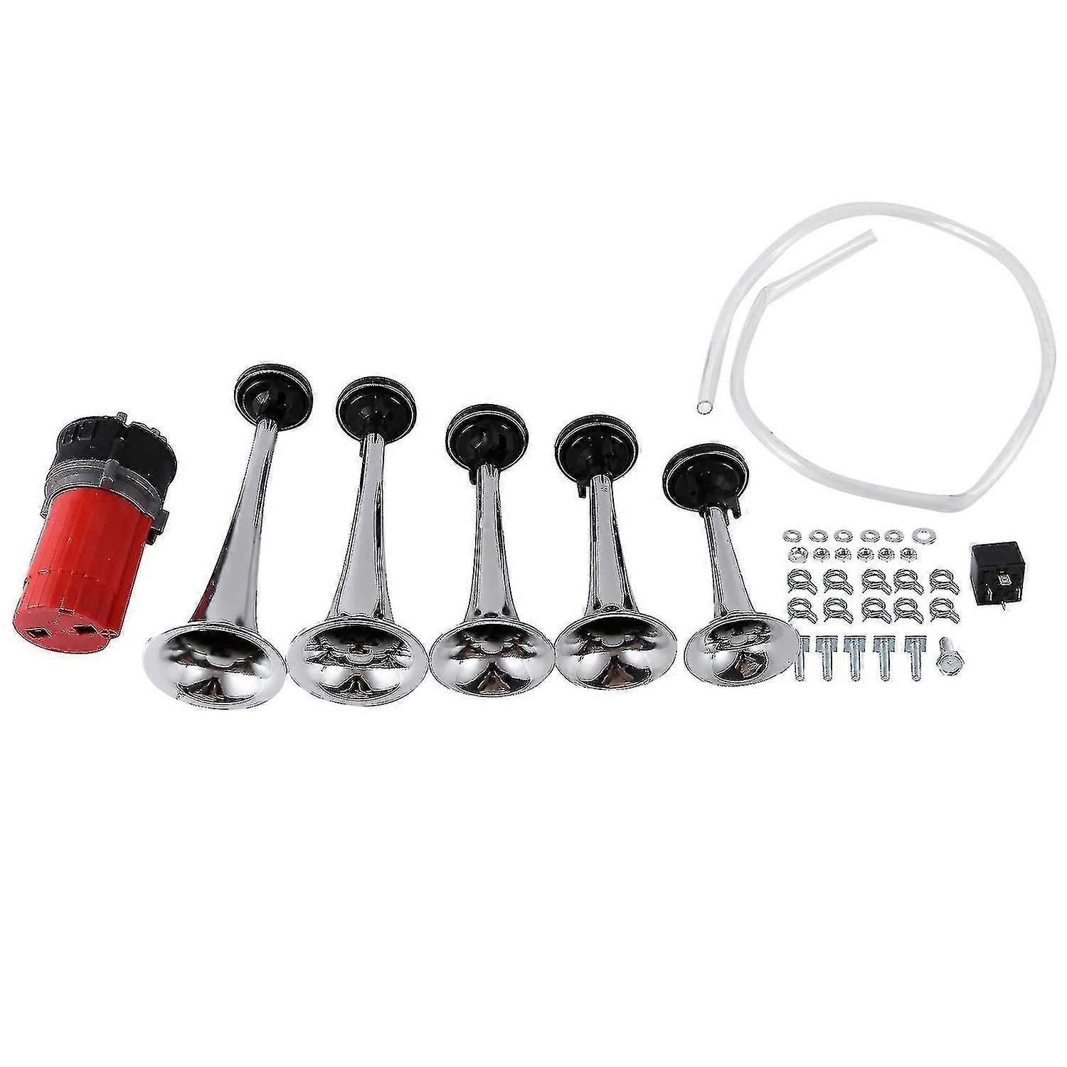 Comes with 5 trumpet 12V air horns Perfect replacement Plays the melody This horn sounds like used on the General from the of Hazzard movie. Fit for cars, trucks, busses, boats and any 12 volt vehicles Sound Pressure Level: 125db Trumpet Diameter: 3.3 inch / 3.1 inch / 3 inch / 3 inch / 2.8 inch Trumpet Lengths: 10.7 inch / 9.6 inch / 8.3 inch / 7.6 inch / 6.2 inch Material:Plastic, metal colour:Red , Silver Package Contents: 5 x small air horn 1 x air compressor 1 x trachea 1 x installation hardware 1 x 12V relay Only the above package content, other products are not included. Note: Light and different displays may cause the color of the item in the picture a little different from the real thing. The measurement allowed error is +/- 1-3cm.