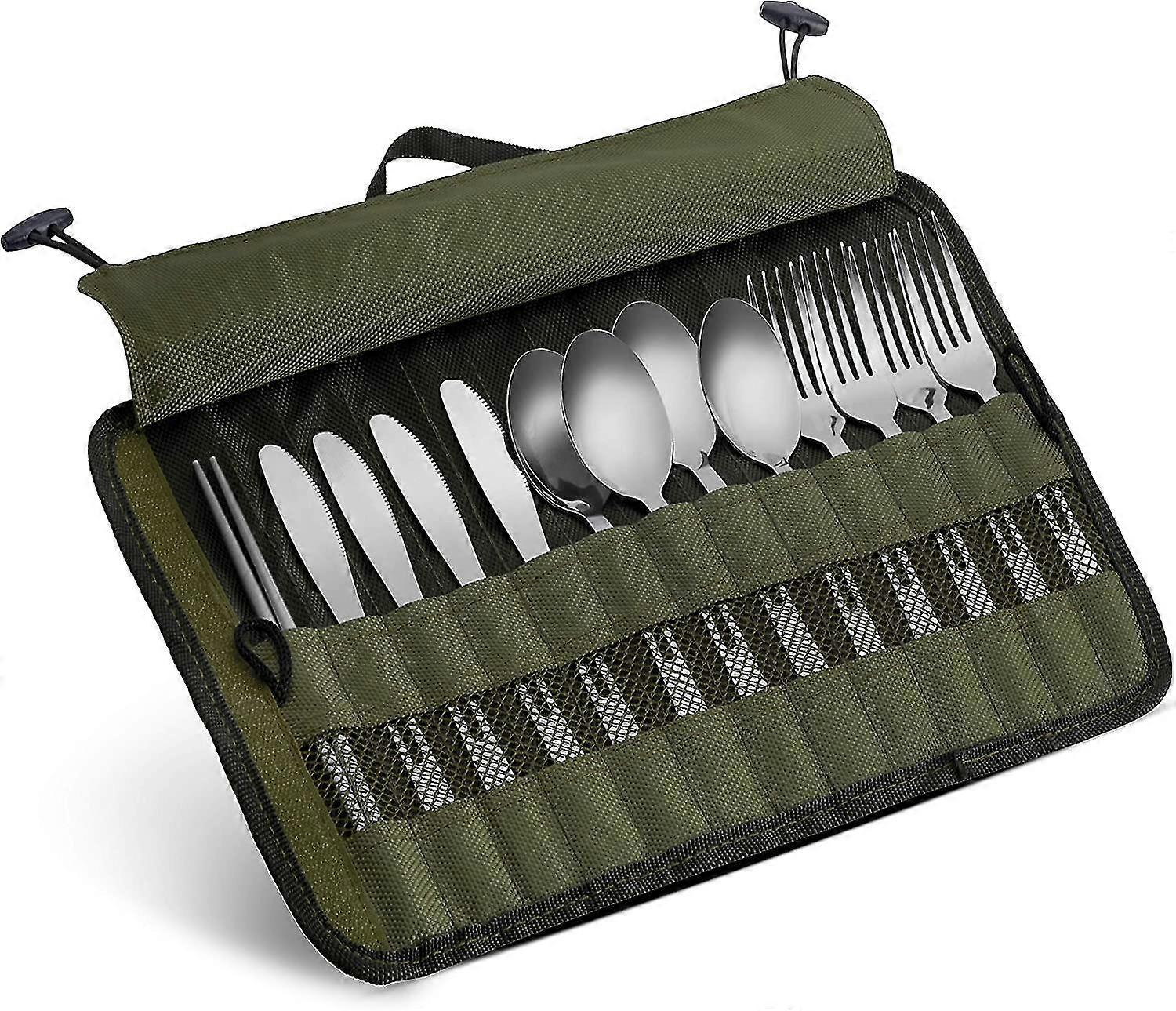 13 Piece Stainless Steel Home Utensils Picnic Utensils Set Bbq - Fork Included | Spoon | Knife | Chopsticks Plus Nylon Commuter Bag (green)