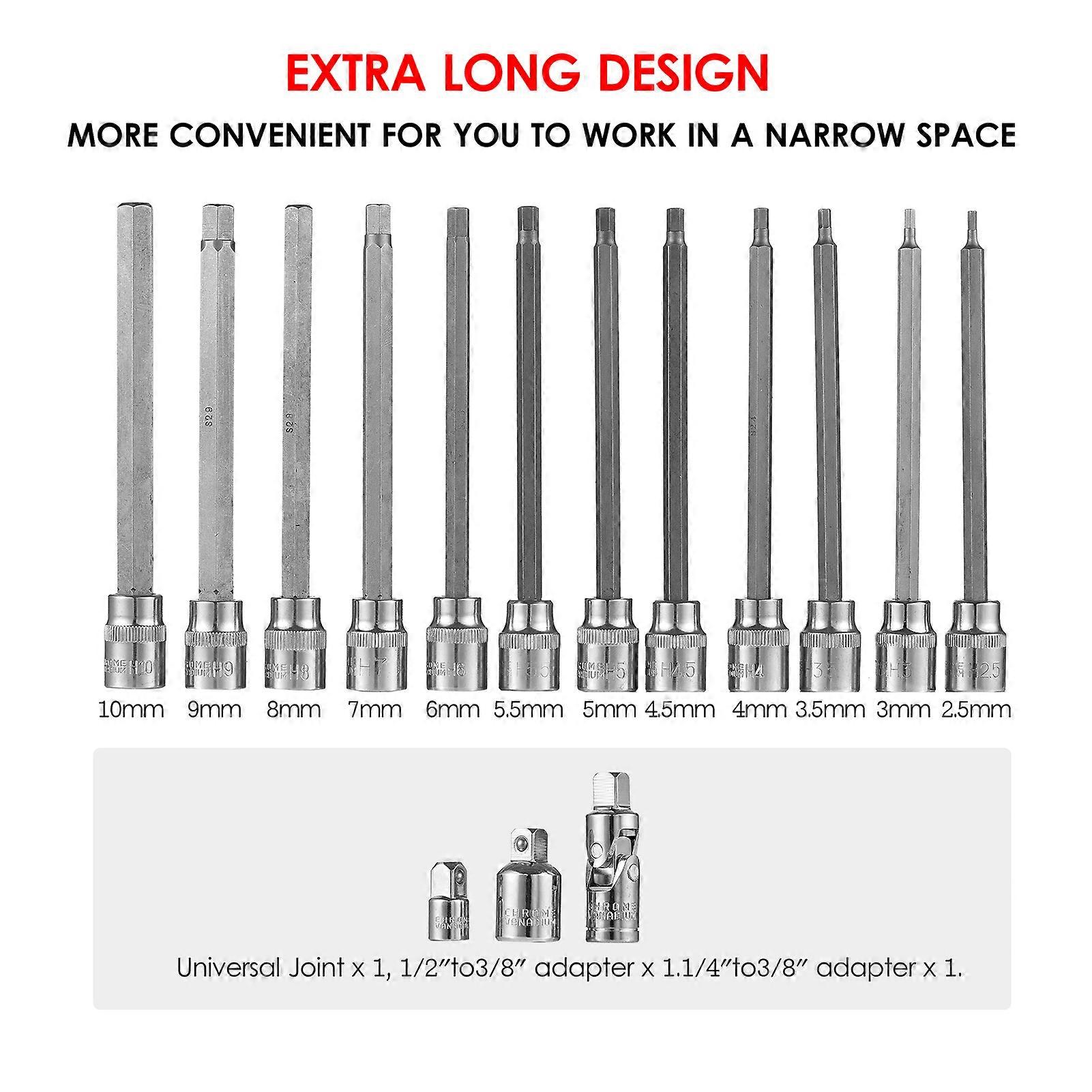 15PCS 3/8" Drive Metric Extra Long Allen Hex Bit Socket Set 3mm-10mm with 6" Shaft Length Premium S2 Steel Heavy Duty Cr-V Sockets