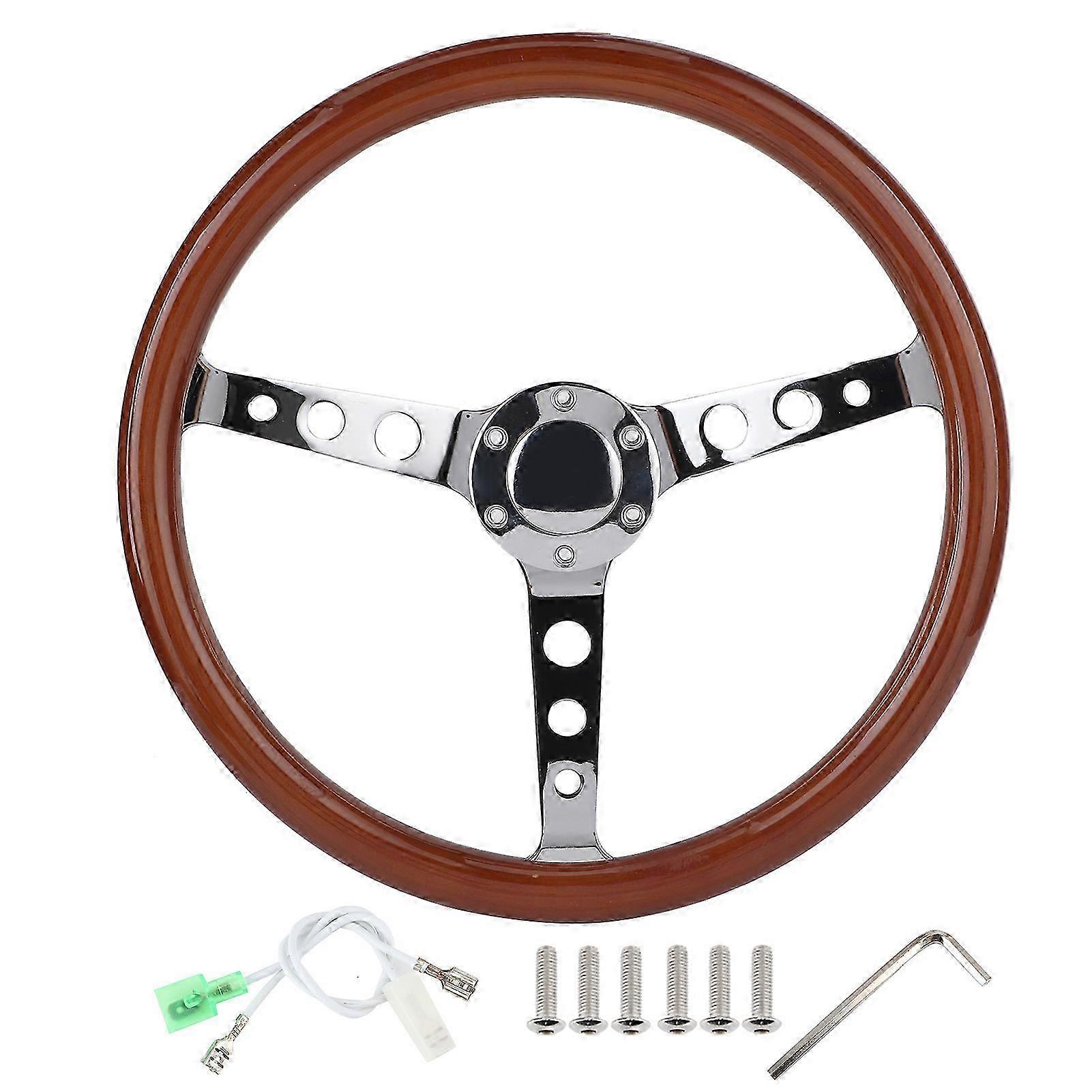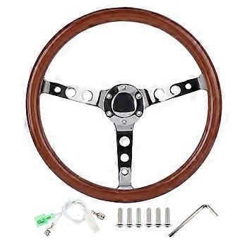 15in 6-Hole Steering Wheel Retro Mahogany Wood Grip Stainless Steel Spoke with Horn Cover Cable