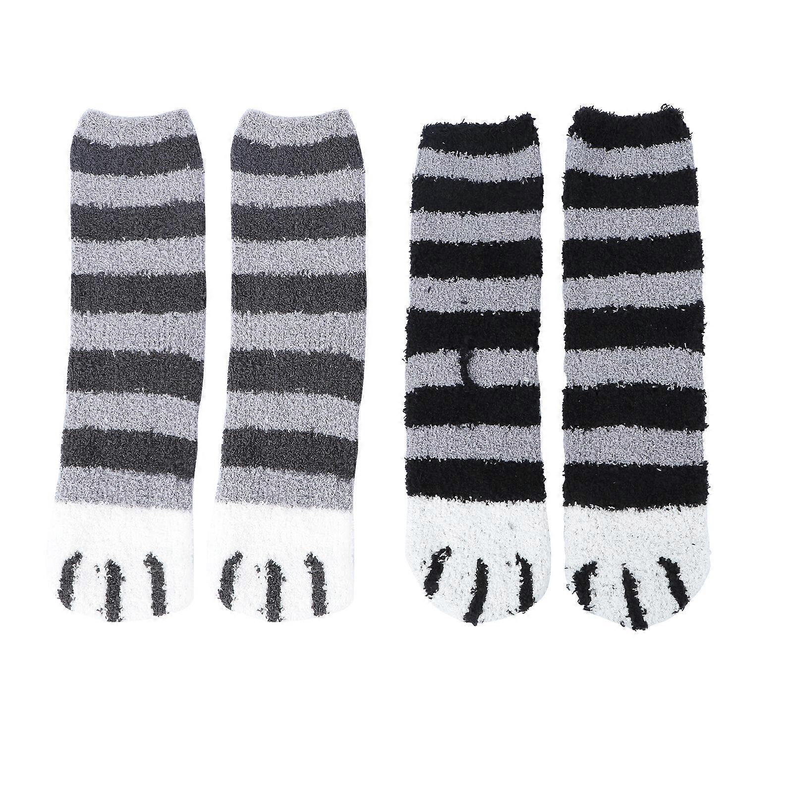 2 Pair Thicken Coral Fleece Middle Tube Cat's Claws Pattern Socks Warm Floor Socks Fluffy Sleep Bed Socks (Stripes Black, Stripes Grey)