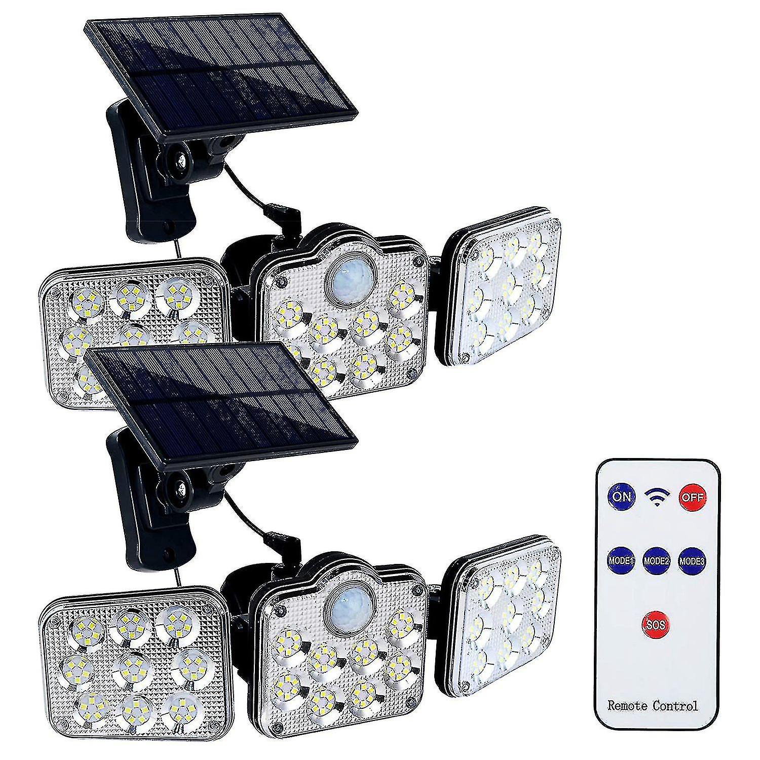 [TWO INSTALLATION WAYS]Integrated and separate installation methods. 138 LED solar light outdoor can better meet your lighting needs. Separate installation can optimize the use of lights, install the light in any place where light is needed, and the solar panel can install in a place that gets more sunlight.[PIR MOTION SENSOR AND 3 WORKING MODES]Our solar light outdoor with motion sensor can detect movement of 17 feet within a 120-degree angle. (With universal remote control, SOS button has no effect) Automatically shut down during the day. Three modes: 1: SENSING MODE (motion sensor automatically turned ON and OFF, after leaving 15s) 2: DIM MODE (brightest when motion is detected, 10% brightness after leaving 15s) 3: No induction mode (30% brightness constant lighting)[SUPER EFFICIENT WORK]The solar motion lights outdoor have high-efficiency solar panels, 4-6 hours solar energy efficient charging converts into 8-10 hours lighting. 138 super bright LEDs can provide a maximum of 1000 lumens.[ALL WEATHER RESISTANT]Adopt IP65 waterproof and antifreeze technology to deal with all kinds of weather. No longer be afraid of severe weather such as heavy rain, blizzard, and scorching heat. Therefore, you can safely use them as solar front door lights, solar garage lights, solar street lights, solar path lights, solar stair lights, solar garden lights, solar deck lights, etc.size:Solar panel 142x86mmFront light 98x70mmside light 90x70mmMaterial:ABScolour:blackPackage Contents:2 * 3 Heads Solar LightsOnly the above package content, other products are not included.Note: Light shooting and different displays may cause the color of the item in the picture a little different from the real thing. The measurement allowed error is +/- 1-3cm.