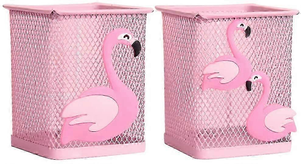 2 Pack Metal Pen Pencil Holder, Cute Flamingo Design Square Desk Organizer for Office Home, Makeup Brush Holder for Girls