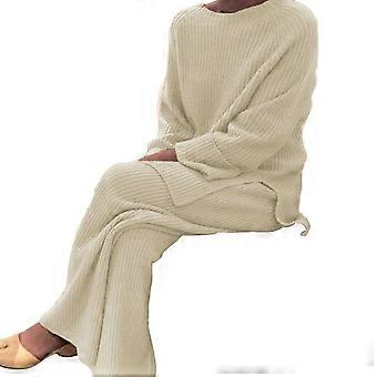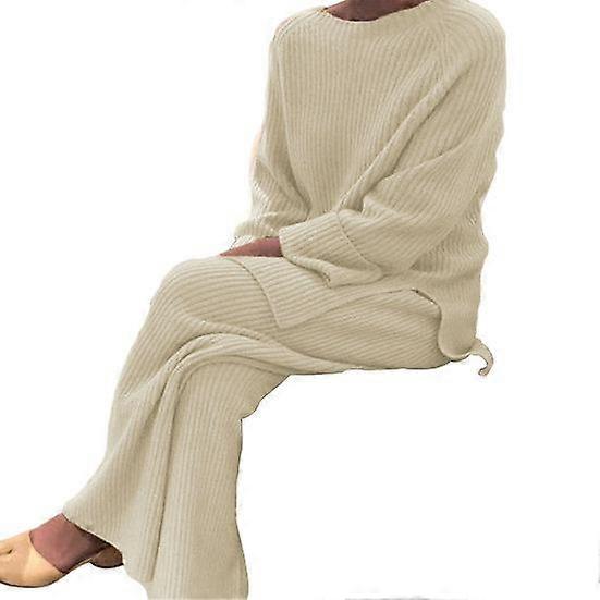 2 Pcs/Set Women Sweater Pants Set Knitted Stretchy Round Neck Loose Wide Leg Elastic Waist Thick Soft Warm Homewear Sleepwear Lady Winter Fall