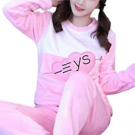 2Pcs/Set Sweet Flannel Pajamas Long Sleeves Coldproof Thickened Autumn Winter Heart Print Two-Piece Fleece Homewear for Adult