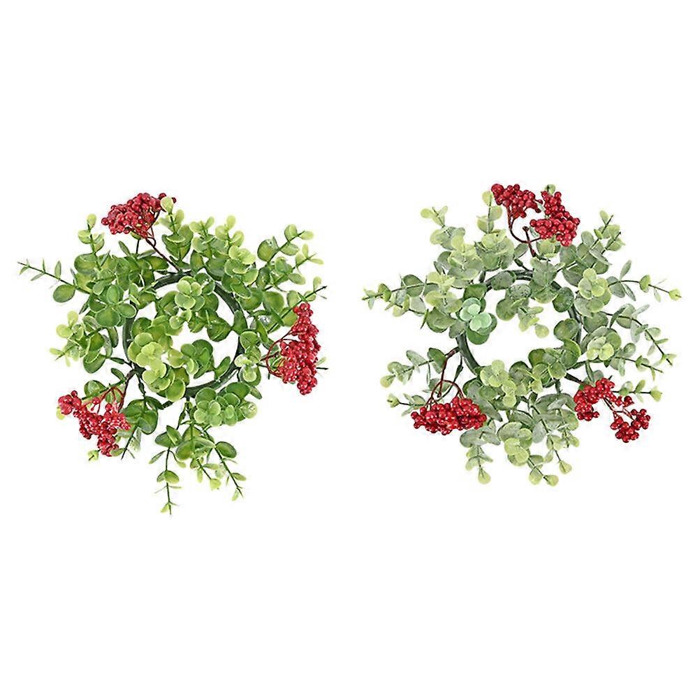 2Pcs Christmas Candle Ring Wreaths Artificial Eucalyptus Leaves Red Berry Wreaths Candle Rings Wreaths