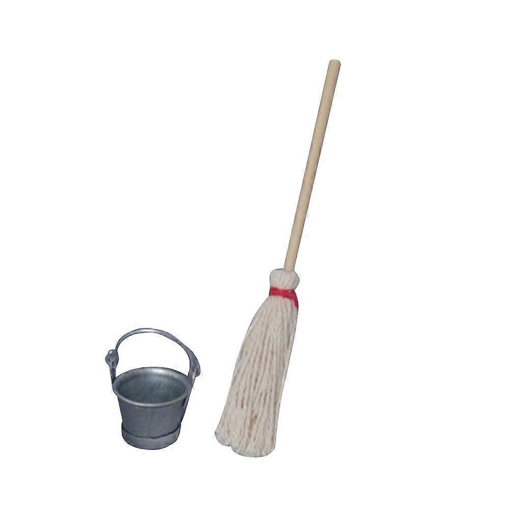 2pcs Mini Creative Fairy Garden Furniture Mop Bucket 12:1 Mini House Miniature Furniture Accessories for Kids Playing With (Mop + Bucket)