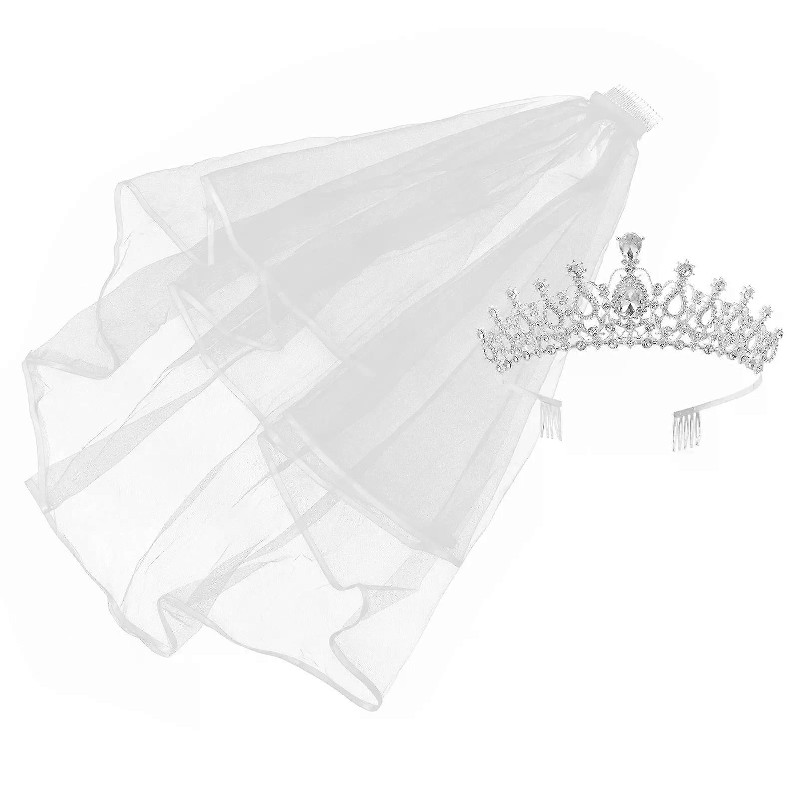2 PCS White Veil Girl Wedding and Tiara Veils with Comb Ivory Crown Lace Rhinestones