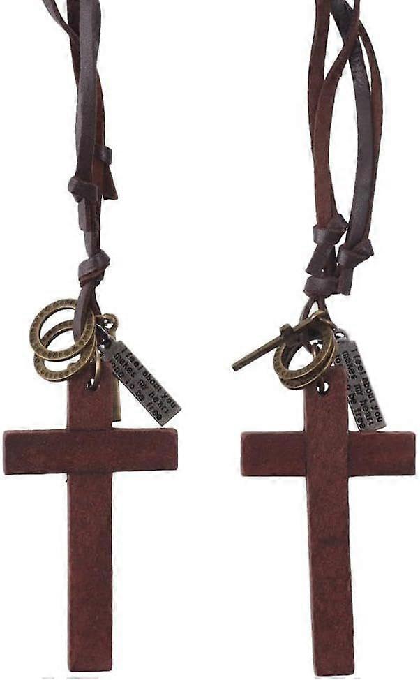 2pcs Cross Hanging Ornament: Vintage Wooden Cross Rearview Mirror Pendant Car Interior Accessories With Letter Tag Decorative Charm For Automotive Tru