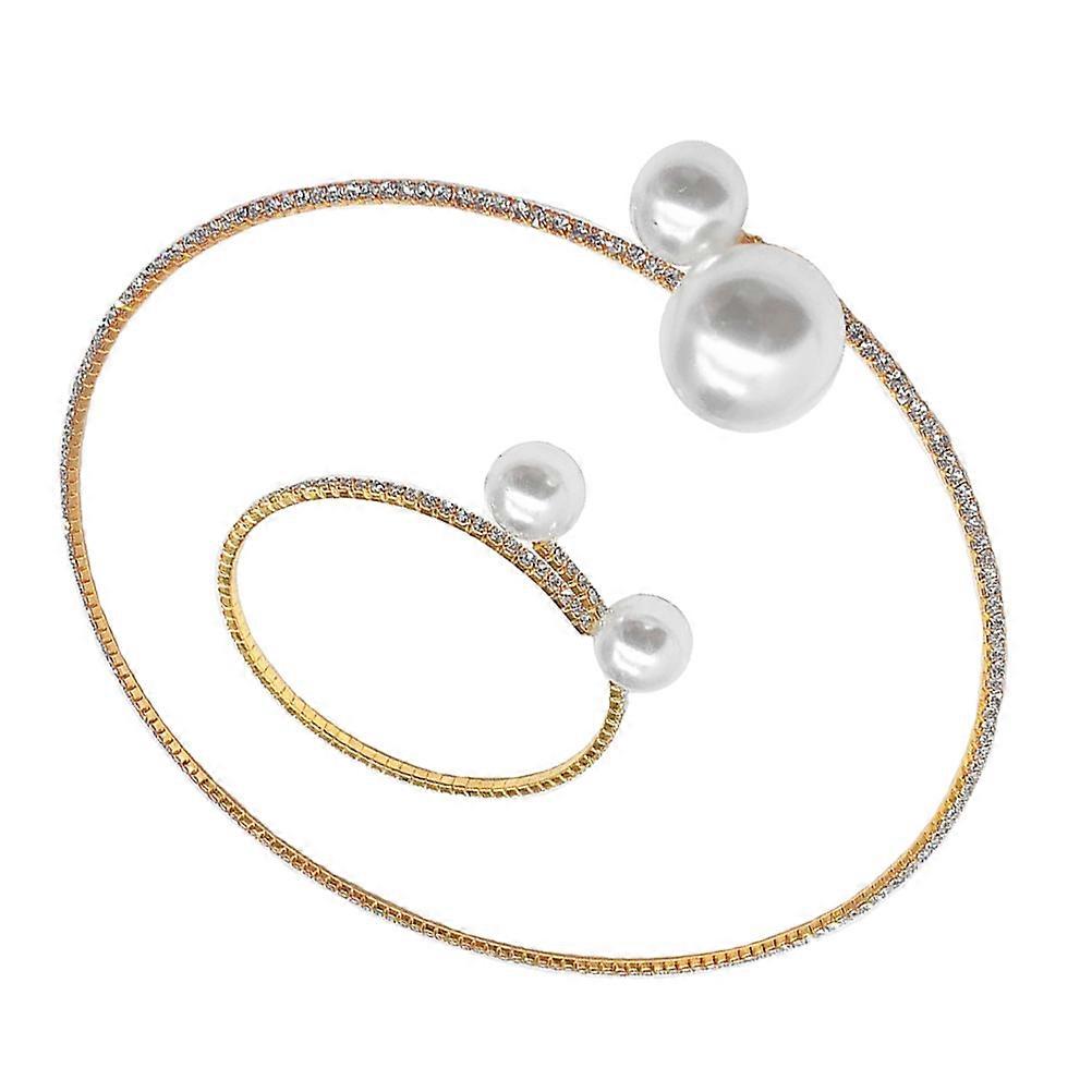 2Pcs Pearl Hand Chain Necklace Set Ladies Fashion Pearl Bracelet Bride Jewelry Neck Choker Wedding Dress Accessory (Golden)