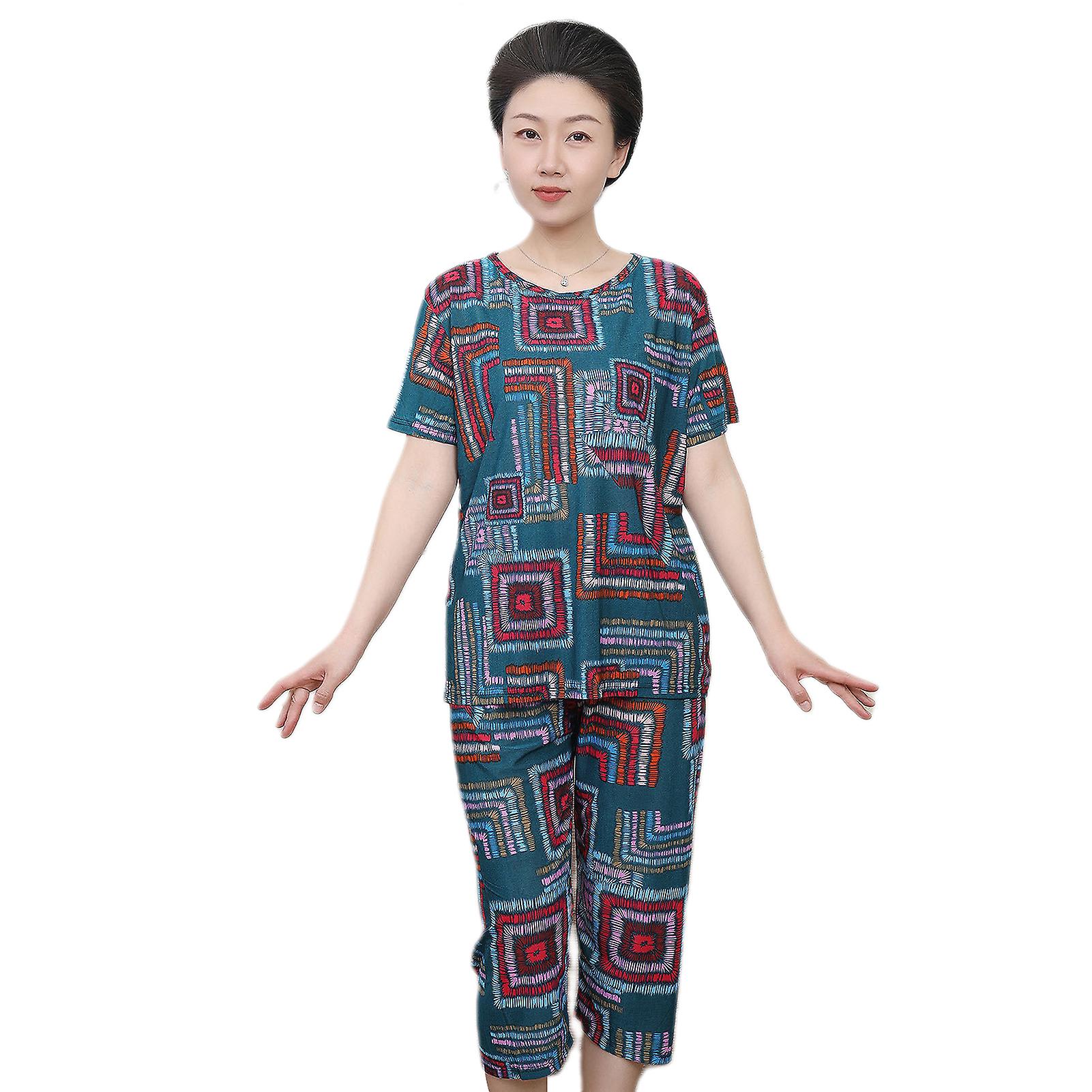 Material: This 2-piece pajama set is crafted from soft and breathable polyester fabric, ensuring a comfortable and relaxing fit for lounging or sleeping. The lightweight material is gentle on the skin and retains its shape well, making it ideal for everyday wear.Design: The women's pajama tops feature classic crew necks, short sleeves, and charming geometric prints that add a touch of style to your loungewear collection. The cute print designs bring a fun and playful element to your bedtime routine.Style: Embrace the summer vibes with this two-piece resort suit that exudes casual elegance. Perfect for beach vacations or lazy days at home, this matching set offers a relaxed and chic look that is both comfortable and fashionable.Fit: The pajama pants in this set are designed with a loose straight cut and an elastic waistband, ensuring a comfortable and flattering fit for all body types. The three-quarter length adds a touch of versatility, making them suitable for various activities from lounging to yoga session.Occasion: Whether you're unwinding at home, enjoying a slumber party, or traveling on vacation, these soft loungewear pieces are perfect for spring and summer wear.