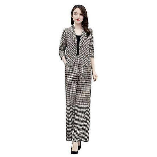 This women's suit is crafted from high-quality polyester fiber, ensuring breathability, lightness, and comfort for year-round wear. The suit features a regular fit that accentuates your silhouette while offering optimal comfort, making it suitable for various body shapes and sizes. Embrace a casual yet chic style with this two-piece set, comprising a long-sleeved jacket top and straight wide-leg trousers, perfect for showcasing your individual charm effortlessly. Pairing: Elevate your look by pairing this elegant suit with heels or sandals for a sophisticated and fashionable ensemble. Accessorize with jewelry and stylish handbags to enhance your overall appearance. Occasions: This versatile suit is a wardrobe essential suitable for work, parties, vacations, casual outings, or romantic dates. Its simple yet elegant design makes it a go-to choice for various occasions. Description: Elevate your style with this chic Women's Suit crafted from breathable and lightweight polyester fiber. Perfect for spring, summer, and autumn, this two-piece set features a long-sleeved jacket top and wide-leg trousers designed for comfort and style. The regular fit flatters all body shapes, showcasing your unique charm effortlessly. Pair this versatile ensemble with high heels or sandals for a sophisticated look that transitions seamlessly from work to parties, vacations, or casual outings. Embrace simplicity and elegance with this must-have addition to your wardrobe. Item Name: Coat Pants Set Material: Polyester Gender: Women Style: Formal Coat Length: Regular Size Type: Regular Pants Length: Full Length Size Type: Regular Season: Summer Collar: Turn-down Collar Waist: High Waist Sleeve: Long Sleeves Features: Wide Leg, Straight, Plaid Print Size Details: Size: M, Bust: 100cm, Coat Length: 50cm, Sleeve: 57cm, Shoulder: 41cm, Waist: 70cm, Hip: 96cm, Pants Length: 93cm(Approx.) Size: L, Bust: 104cm, Coat Length: 51cm, Sleeve: 58cm, Shoulder: 42cm, Waist: 74cm, Hip: 100cm, Pants Length: 94cm(Approx.) Size: XL, Bust: 108cm, Coat Length: 52cm, Sleeve: 59cm, Shoulder: 43cm, Waist: 78cm, Hip: 104cm, Pants Length: 95cm(Approx.) Size: 2XL, Bust: 112cm, Coat Length: 53cm, Sleeve: 60cm, Shoulder: 44cm, Waist: 82cm, Hip: 108cm, Pants Length: 96cm (Approx.) Size: 3XL, Bust: 116cm, Coat Length: 54cm, Sleeve: 61cm, Shoulder: 45cm, Waist: 86cm, Hip: 112cm, Pants Length: 97cm(Approx.) Notes: Please refer to our size chart and choose the right size. Due to the light and screen setting difference, the item's color may be slightly different from the pictures. Package Includes: 1 x Coat 1 x Pants