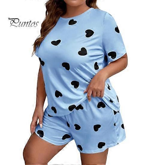 2 Pcs/Set Women Summer Pajamas Cartoon Heart Print Round Neck Short Sleeve T-shirt Elastic Waist Shorts Lady Plus Size Loungewear Sleepwear Set