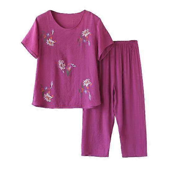 2 Pcs/Set Mid-aged Women Pajamas Set O Neck Flower Print Short Sleeve Elastic Waist Pleated