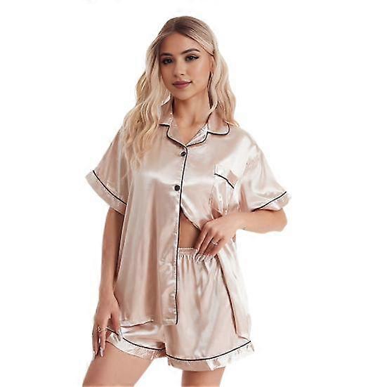 2 Pcs/Set Women Pajamas Solid Color Silky Lapel Elastic Waist Short Sleeves Chest Pocket