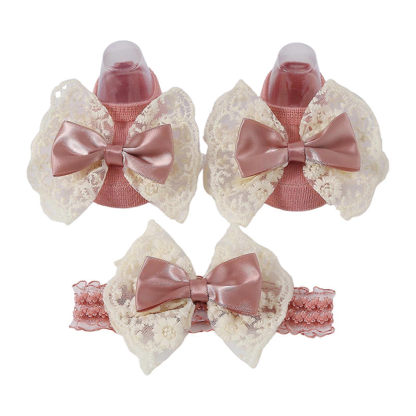 2Pcs/Set Infant Headdress & Walking Socks Baby Socks Bowknot Headband Toddlers Hair Band and Knitted Floor Socks Rubber Pink