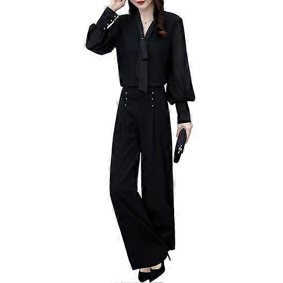 2 Pcs/Set OL Commuting Outfit Shirt Pants Set Pure Color V Neck Long Sleeve Blouse High Waist Wide Leg Trousers Business Office Clothes